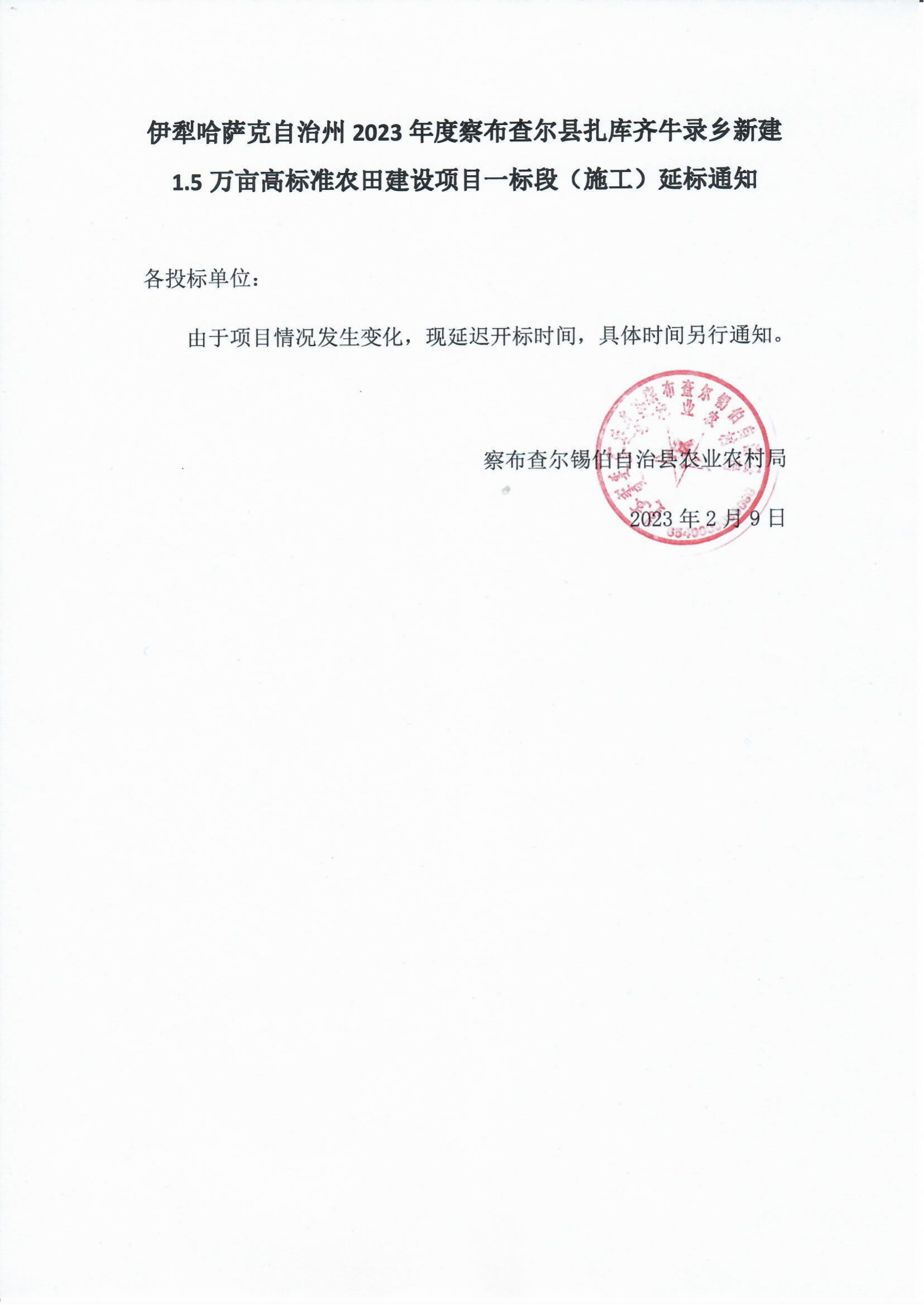 伊犁哈萨克自治州2023年度察布查尔县扎库齐牛录乡新建1.5万亩高标准农田建设项目一标段(施工)