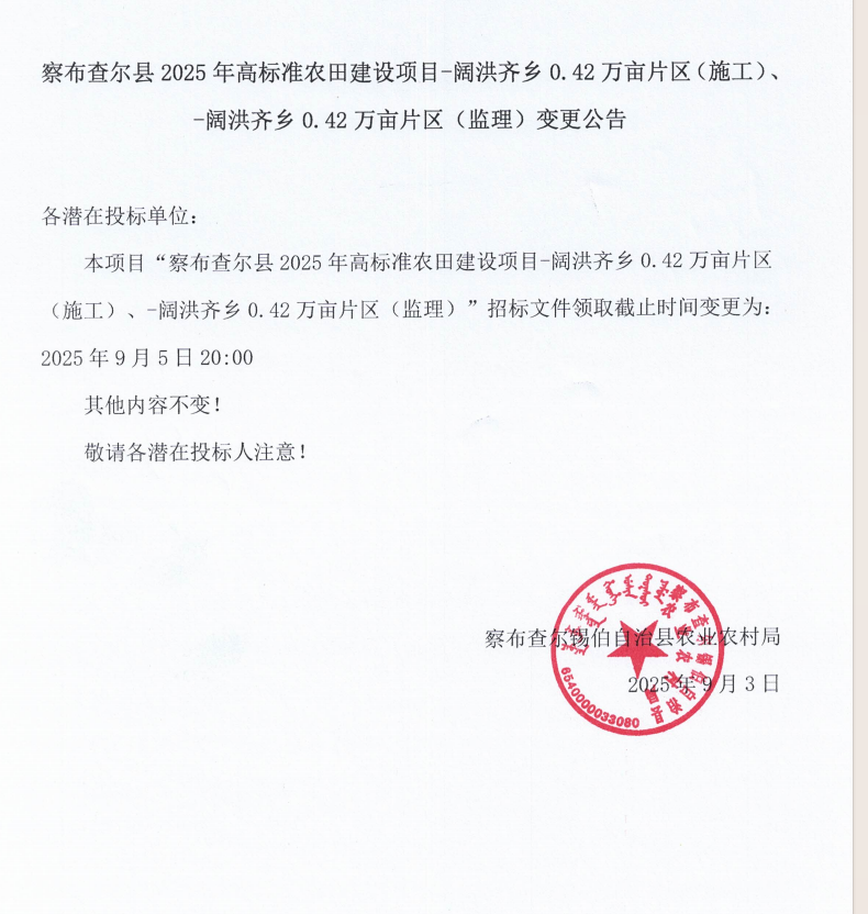 察布查尔县2025年高标准农田建设项目-阔洪齐乡0.42万亩片区(施工)、-阔洪齐乡0.42万亩片区(监理)