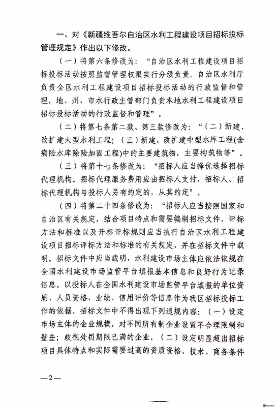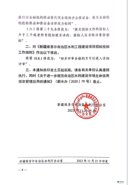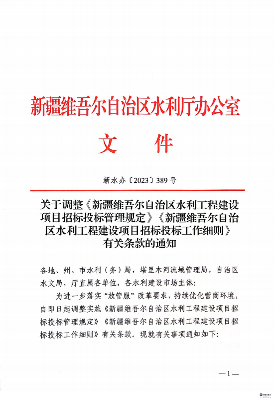关于调整《新疆维吾尔自治区水利工程建设项目招标投标管理规定》有关条款的通知(新水办【2023】389号)
