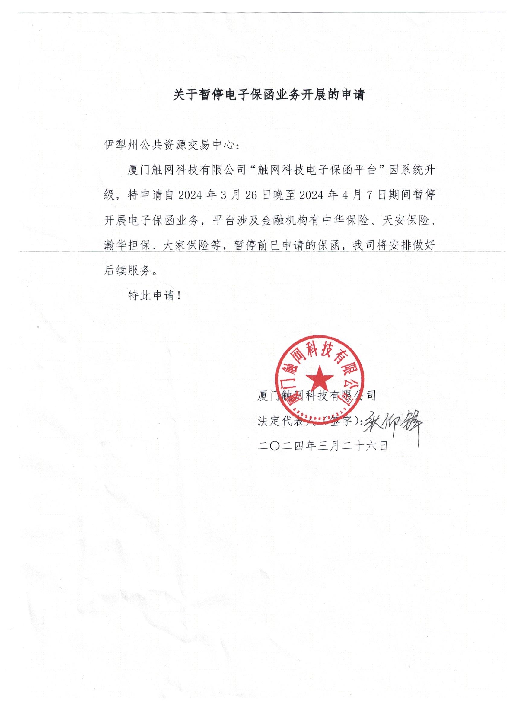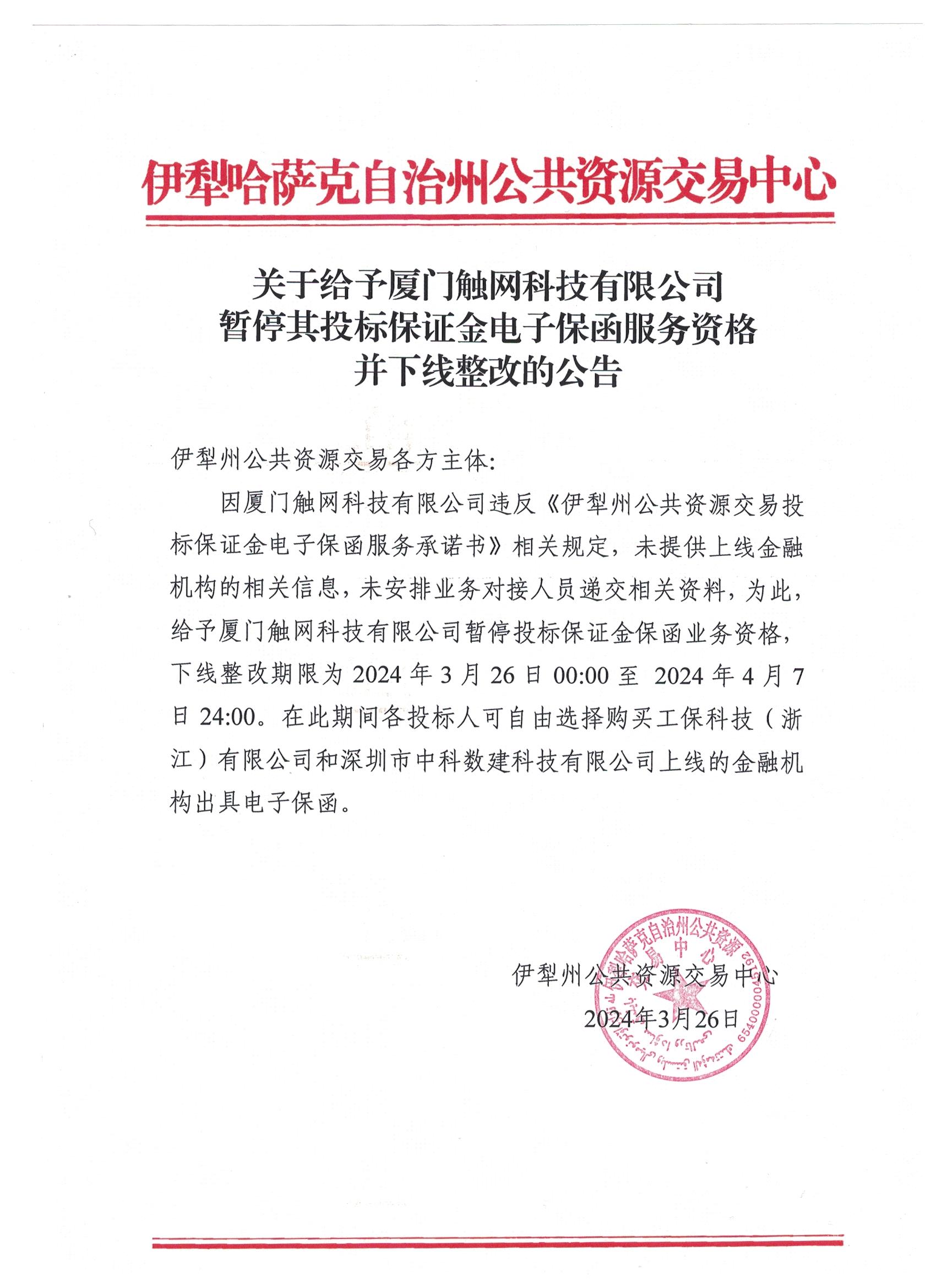 关于给予厦门触网科技有限公司暂停其投标保证金电子保函服务资格并下线整改的公告