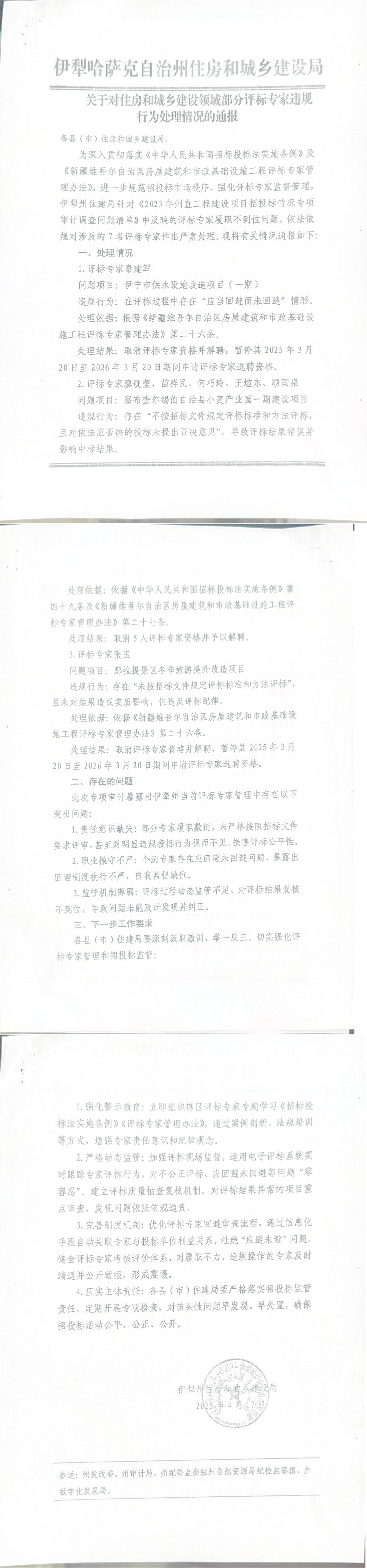 关于对住房和城乡建设领域部分评标专家违规行为处理情况的通报