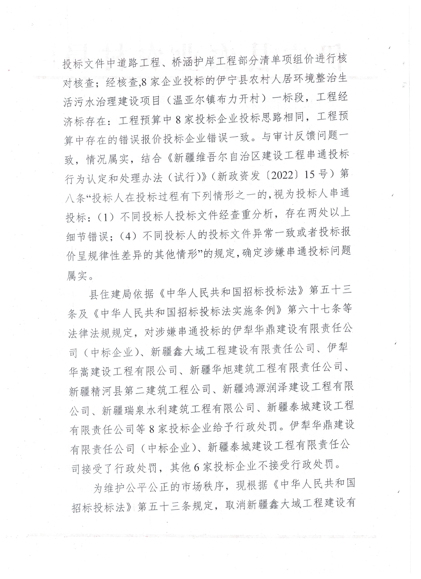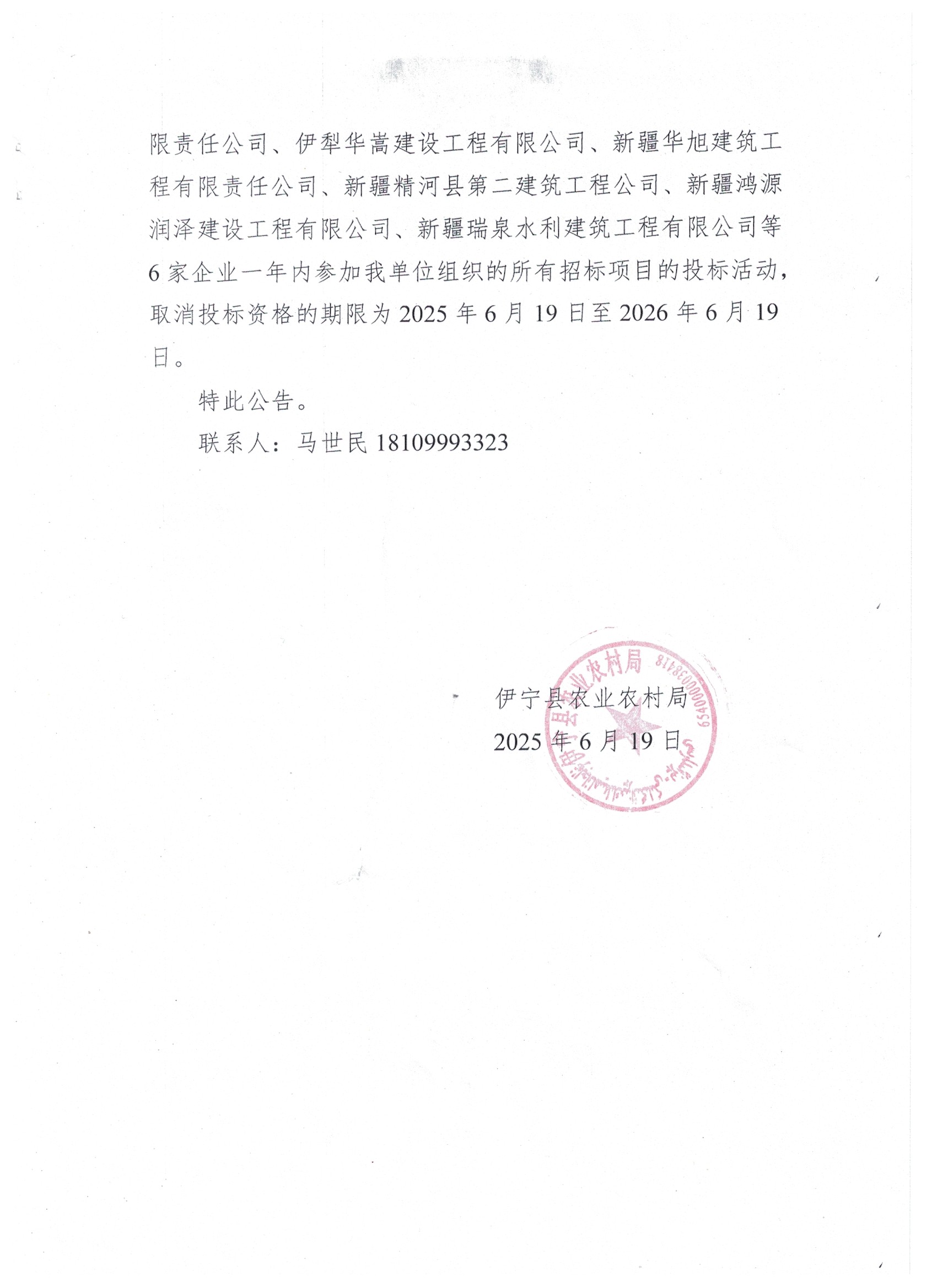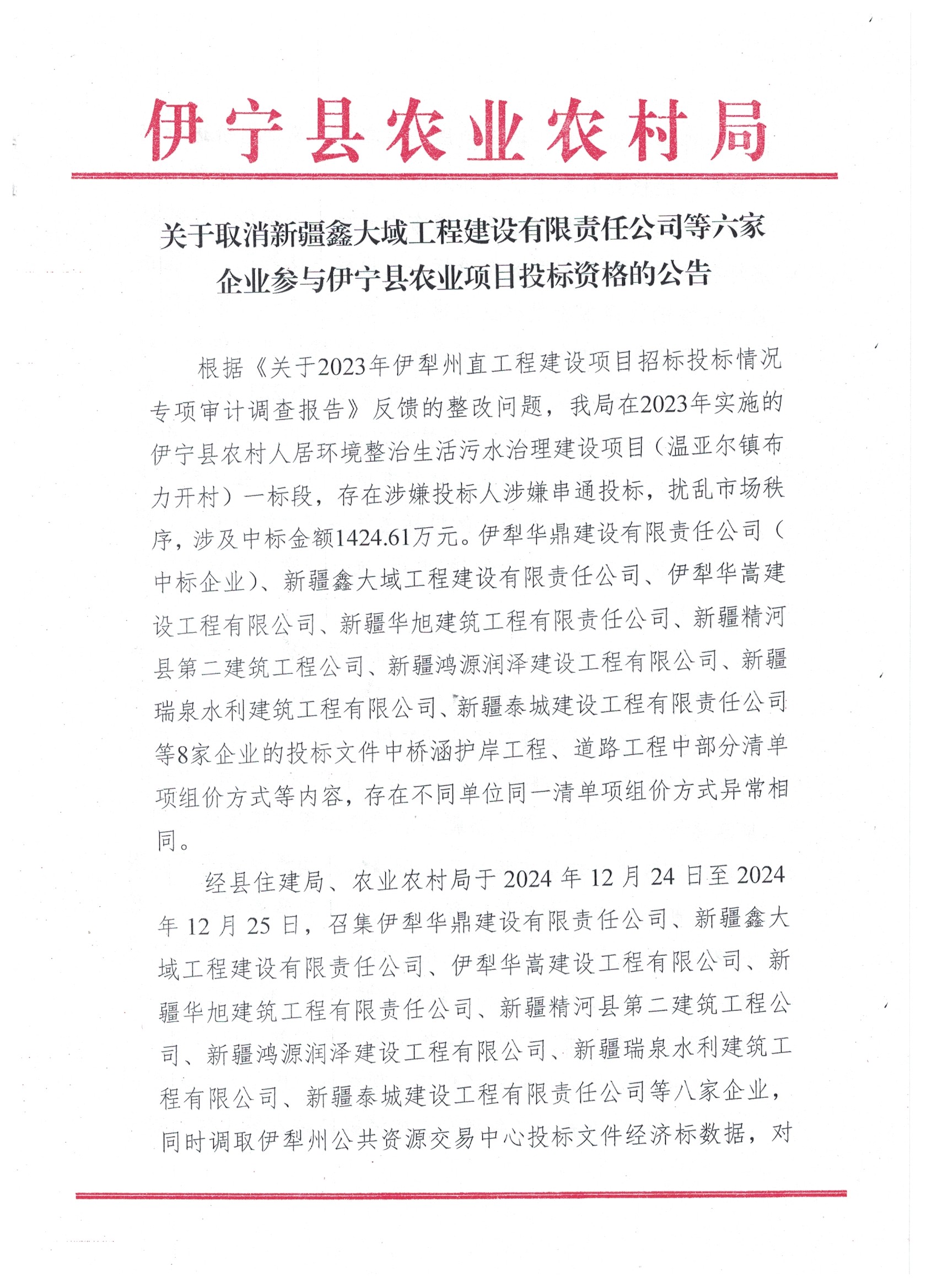 关于取消新疆鑫大域工程建设有限责任公司等六家企业参与伊宁县农业项目投标资格的公告